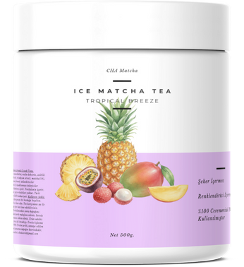Sadece toz karışımının üstüne 250ml soğuk su ekleyin ve Tropikal Meyve aromalı Ice Matcha Tea'niz hazır. Rengini doğal matcha renginden alır. Şeker ve renklendirici içermez.
