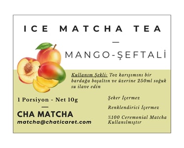 Sadece toz karışımının üstüne 250ml soğuk su ekleyin ve Mango ve Şeftali aromalı Ice Matcha Tea'niz hazır. Rengini doğal matcha renginden alır. Şeker ve renklendirici içermez.