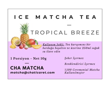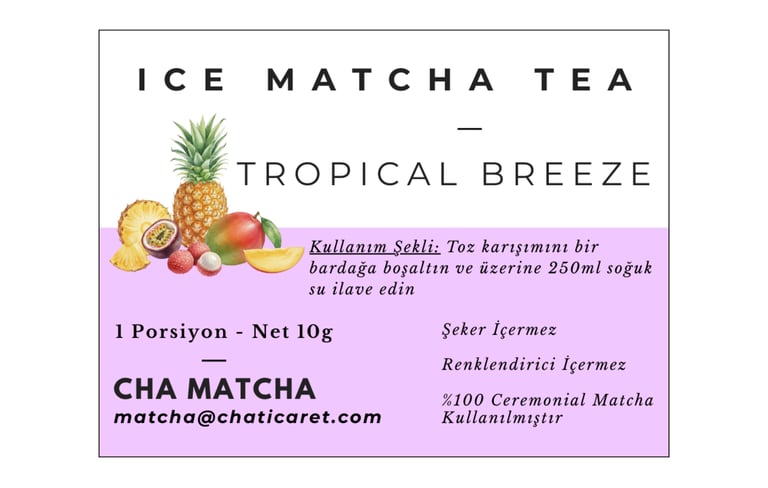 Sadece toz karışımının üstüne 250ml soğuk su ekleyin ve Tropikal meyve aromalı Ice Matcha Tea'niz hazır. Rengini doğal matcha renginden alır. Şeker ve renklendirici içermez.